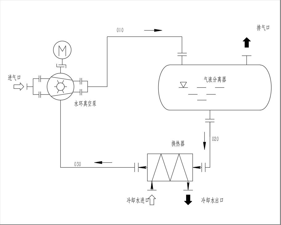 被抽氣體從吸氣口進入液環(huán)真空泵,經(jīng)液環(huán)真空泵壓縮后與部分工作液一起由010管線進入氣液分離器,在氣液分離器內(nèi)氣液兩相得到分離,氣體從排氣口排出,工作液經(jīng)020管線至換熱器冷卻后經(jīng)由030管線被液環(huán)泵吸入進行循環(huán)使用。
