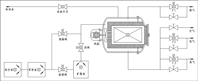 (1)、爐體:爐體由爐蓋、筒體組成,主爐體是一個臥式放置的爐體。其中爐體(爐殼、爐門)采用雙層爐壁結(jié)構(gòu),夾層中通水冷卻。爐門為左開式,在其上邊設(shè)計有一個供操作者觀察的石英玻璃窗。真空管道上設(shè)計有防止破壞真空泵組正常工作的過濾器。兩個加熱供電連接線電極分別裝在爐體左右兩側(cè)。爐體外上部裝有爐內(nèi)溫度測量接線機構(gòu)、接點式真空壓力表和出氣體管道。爐體外下部裝有進氣體管道。爐體內(nèi)裝有加熱體、保溫層、工件支承體(料臺)等。